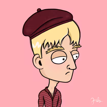 Collection Depressed Citizens Artist Juls Description ART. No team, no project, no future. Depressed Citizens is an urban & existential Art expression on Ordinals. In a parallel universe, "THEI" control us. DC unites against toxic society, encouraging critical thinking. 100% hand made collection that took Juls more than 6 months of daily work. Name Citizen#740 Origin Caucasian non hispanic Gender Man Necklace No Necklace Hat Burgundy beret Mustache Beard No beard Glasses No Glasses Earrings Rook hoop Hair Style Short pixie Clothes Burgundy stripe skinny shirt Tattoo No Tattoo Star Background Without stars